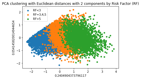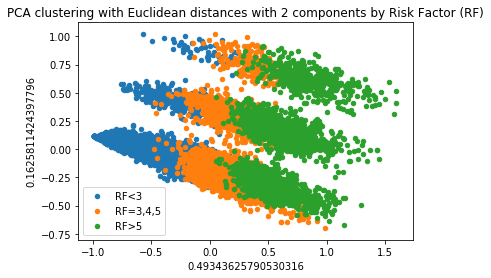 Figure 1 shows the results of PCA on the scales. The responses are clearly clustered into three groups, however these three groups do not correspond to Risk Factor (RF). Upon further investigation, they are clustered according to a scale that only has two questions. Thus, this result reflects a property of the questionnaire’s construction which is not meaningful.